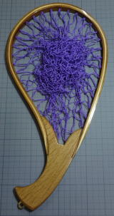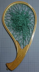 フレーム・グリップ・グリップエンドの接着が完了 紙ヤスリ400番〜1000番で表面を整える。 サンディングシーラーを木目に塗り、コーティング剤 の下地処理をする。 下地処理ができたら、セルロースセメントの 筆塗りを行った。 表面がボテボテになったら耐水ペーパー400番〜 1000番で平面にならし、再び筆塗りを10〜20回 繰り返す。 途中、ネームを入れたりした。 納得いくまでコーティングできたら、コンパウンドで 磨き上げ、ネットを取り付けて完成となる。 |