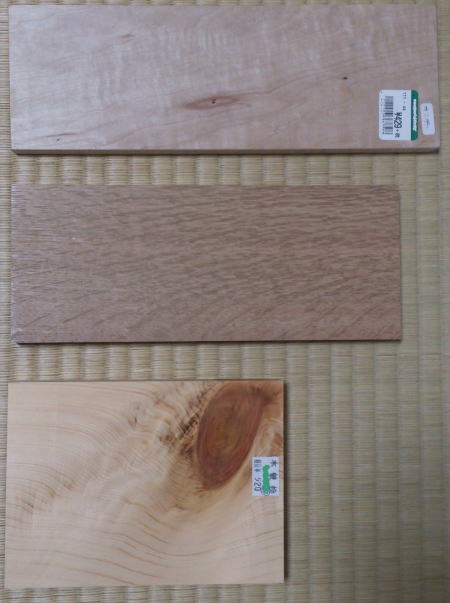上から カエデ(厚さ14mm×幅90mm×長さ268mm) 切る・穴を空ける等の加工は時間がかかった。 白い木目が美しい反射をみせる。 ナラ(厚さ17mm×幅97mm×長さ240mm) 木目にそって材が崩れやすい。 切る・穴を空ける等の加工では養生をうまくしないと 切り口が欠けてしまうため神経をつかった。 独特の木目が綺麗。 木曽桧(厚さ23mm×幅120mm×長さ180mm) 材質としては、柔らかい感じ。 木目にそって材が崩れやすいが、 比較的加工はしやすい。 写真のものは節があり、この部分はかなり堅く 今回の製作ではかなり苦労した。 |
