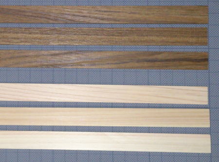 上3つ チーク材(厚さ3mm×幅15mm×長さ900mm) ネットのフレーム枠に使用した。 触ると油分のしっとりとした感触がある。 曲げ加工では、木目にそって曲がろうとするため 木目が材の長さ方向に平行なものを選ばないと うまく曲げるのは難しいと感じた。 下3つ ヒノキ材(厚さ3mm×幅9mm×長さ900mm) 曲げ加工をする上では、素直に曲がってくれるので 綺麗なアーチを作ることが出来た。 柔らかい素材なので、凹み傷がつきやすい。 |