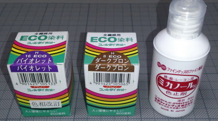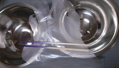 染色用の染料と色止め材 ステンレスボール2個 ビニール手袋 割り箸 写真のほかに食塩、 染料と食塩の分量を正確に測るための キッチン秤りが必要。 作業では、染料が服等につくと色が落ちない。 また、熱湯を使用するため十分な注意が必要。 |