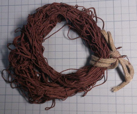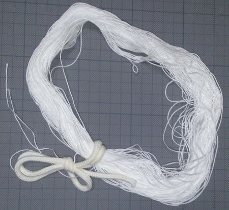 漁網に使用されるという素材 今回使用したのは3号という太さのもの。 長さを測るのは難しいので、重さで使用する 分量を決めるようだ。 今回は26グラム分を使用した。 白では味気ないので、好みの色に染色する。 染色すると糸が縮むので、ネット編みの行程の 前に染色したほうが無難と思われる。 絡むと解くのが地獄のような作業となるので、 注意が必要である。 写真では太さの違う紐を使って束ねるのと 末端の保持をして絡みを抑えている。 |