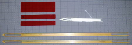 写真の赤いものはネットの目の大きさを決めるコマ プラスチックの下敷きを加工したもの。 上から幅30mm、12mm、13mm。全て長さ100mm 白いものはプラスチック製編み針 下の2本は厚さ2.5mm×幅9mm×全長350mm 竹製編み針。糸巻部は245mmとなっている。 市販品を見つけられなかったため自作した。 |