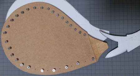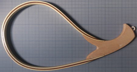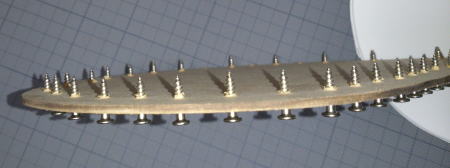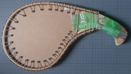MDFと呼ばれる板を使用した。 木材の繊維を樹脂等で固めたものだそうだ。 質感はガムテープの内側の紙をさらに固くした感じ。 木目等がないため、癖がなく加工がしやすい。 厚さは3mmのものをホームセンターで購入した。 外側から約13mm位の位置に木ネジをつける。 フレーム材を糸で固定する際に、ネジの頭と ネジ切り部分が糸を掛ける引っ掛かりになる。 写真ではグリップ材との接点に補強のため 板を貼り合わせてある。 |