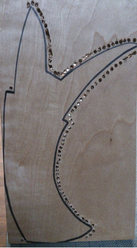 材に型紙をあてがい、油性マジックで形をトレースする。 曲線が多いので、ドリルで穴を空け、糸鋸で穴を繋げるように切り出した。 穴あけの数が多いので、電動ドリルがあると重宝する。 糸鋸の刃はスパイラル刃という多方向にひけるものを使用した。 切り出した後はカッターナイフ等である程度形を整え、 木工ヤスリや紙やすりの40番〜1000番で仕上げた。 フレーム材よりも厚い材のグリップはフレーム材接着後 カンナで削り、厚さ15mm程度に整えた。 |