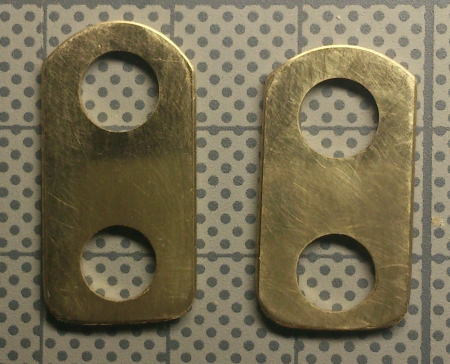 真鍮の素材を切り出して作成。 片方の穴は木材の中で接着剤が噛むようにあけた。 金属用糸鋸やドリルで形成後、金属用の棒ヤスリ等で 形を整え、耐水ペーパー100番〜1000番で傷を取り、 最後にコンパウンドで磨く。 |